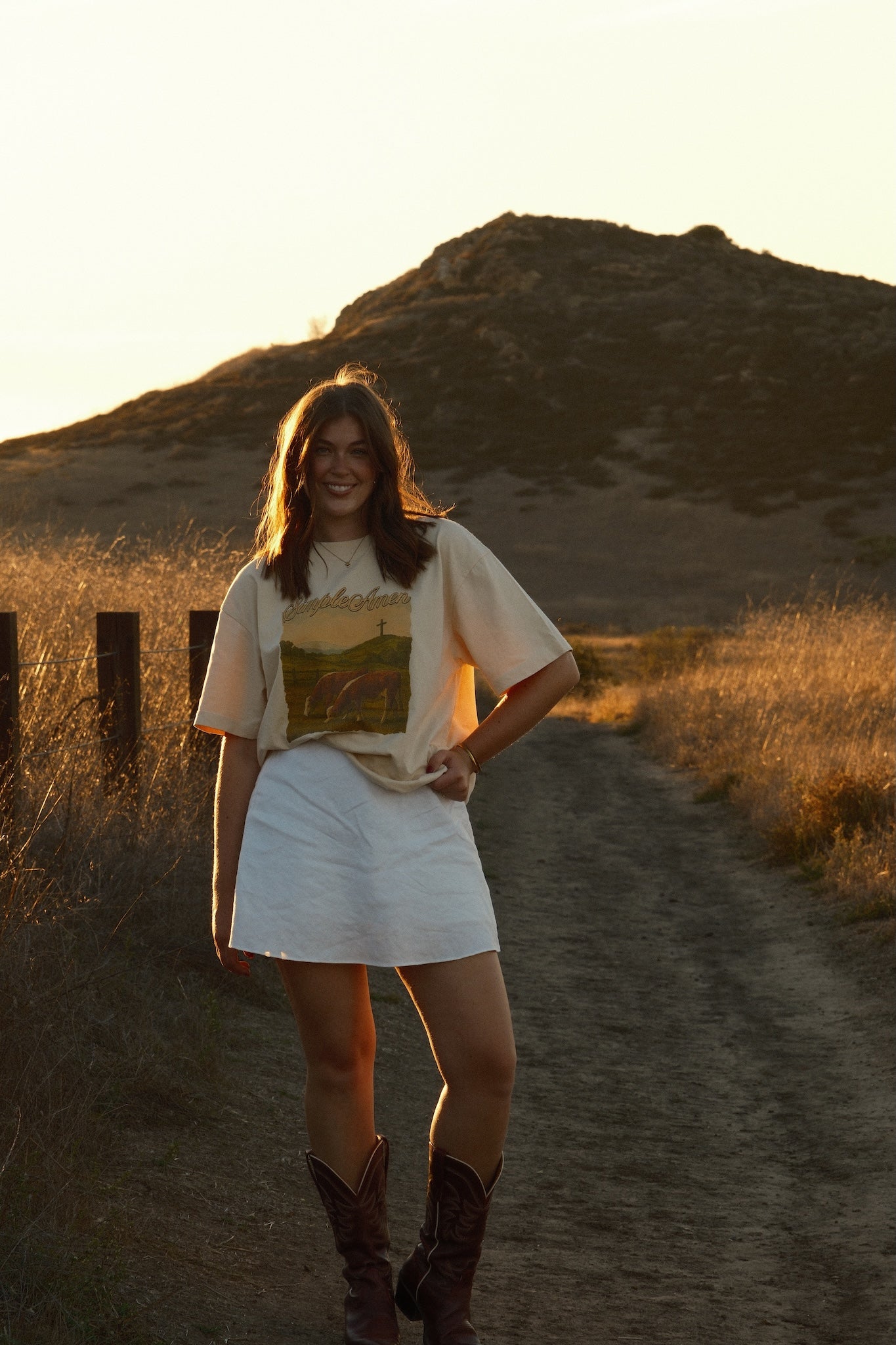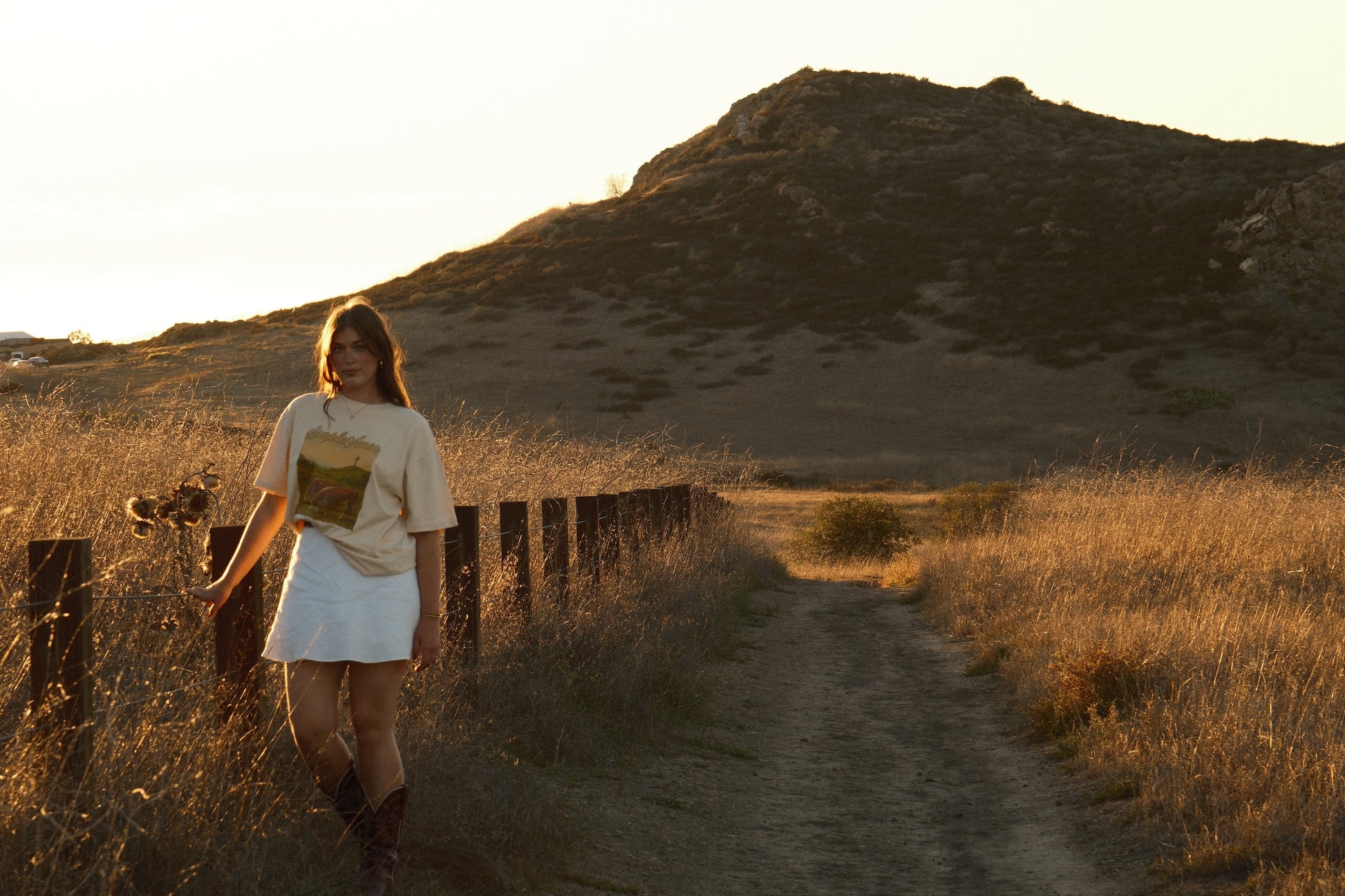 A little postcard from golden hour. Meadow Tee captures small-town stillness—field grass, fence line, and the honey light that says slow down. Printed on soft heavyweight cotton jersey that feels broken-in from the first wear.