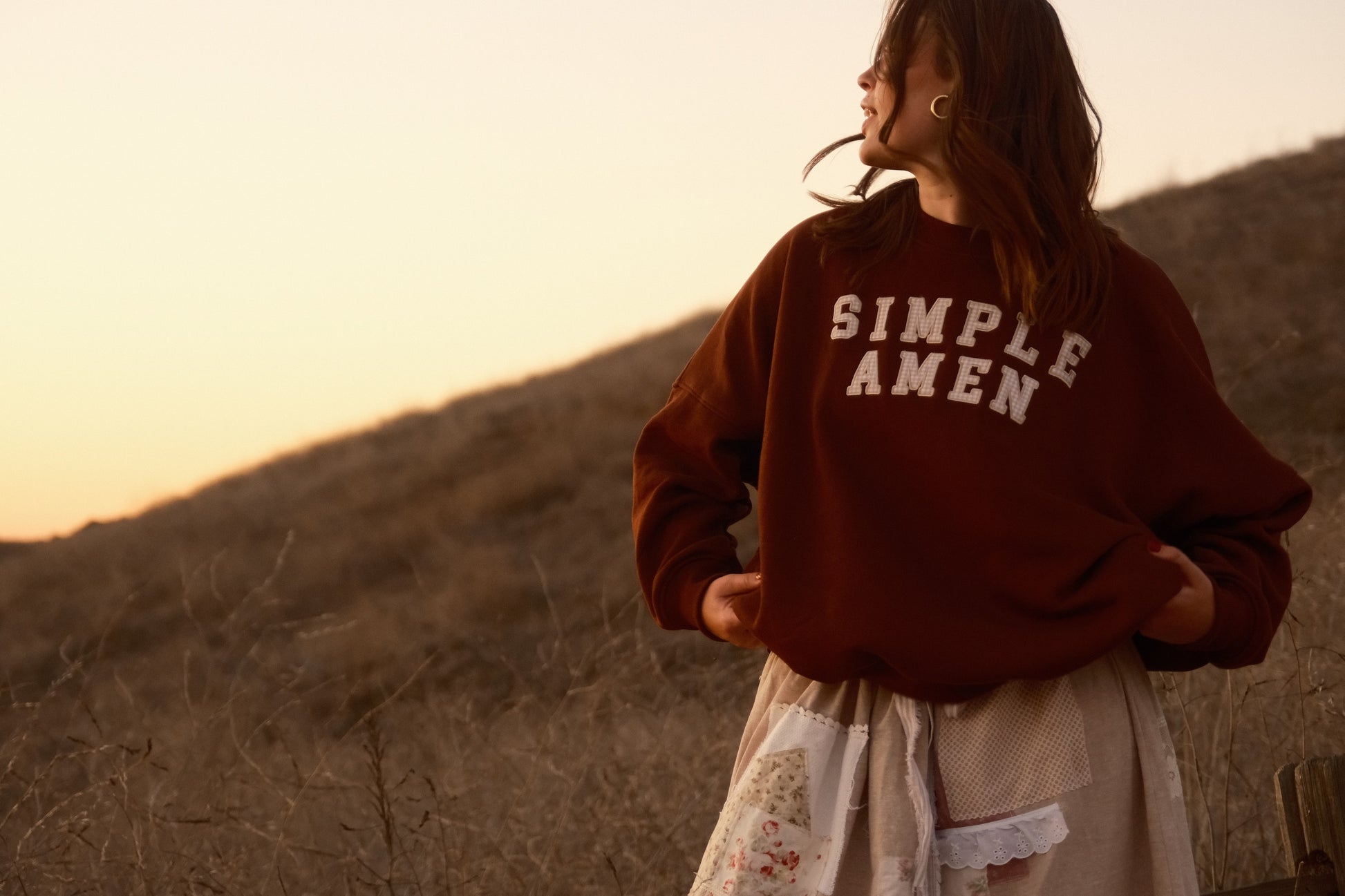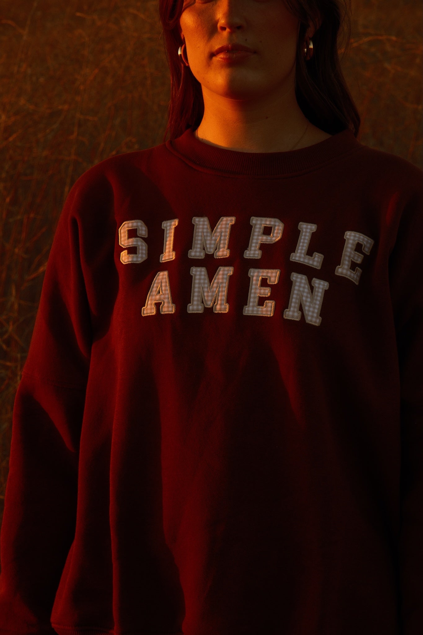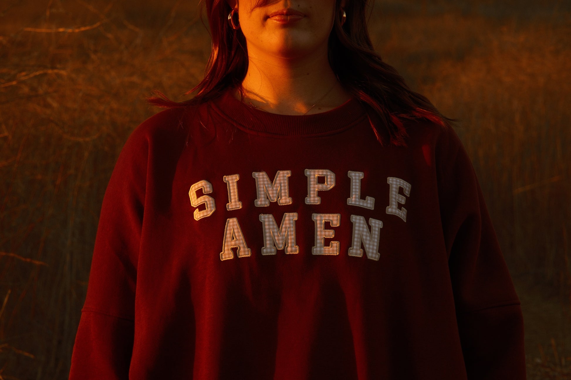 Home, in crewneck form. This intentionally very oversized crewneck wraps you in soft, brushed-fleece comfort with a drapey, slouchy silhouette. Across the front of this brown crewneck, tan gingham “Simple Amen” letters are machine-stitched for a secure, durable finish. Cozy without being heavy, it’s the layer you’ll reach for on slow mornings, late-night drives, and everything in between. One of a kind.