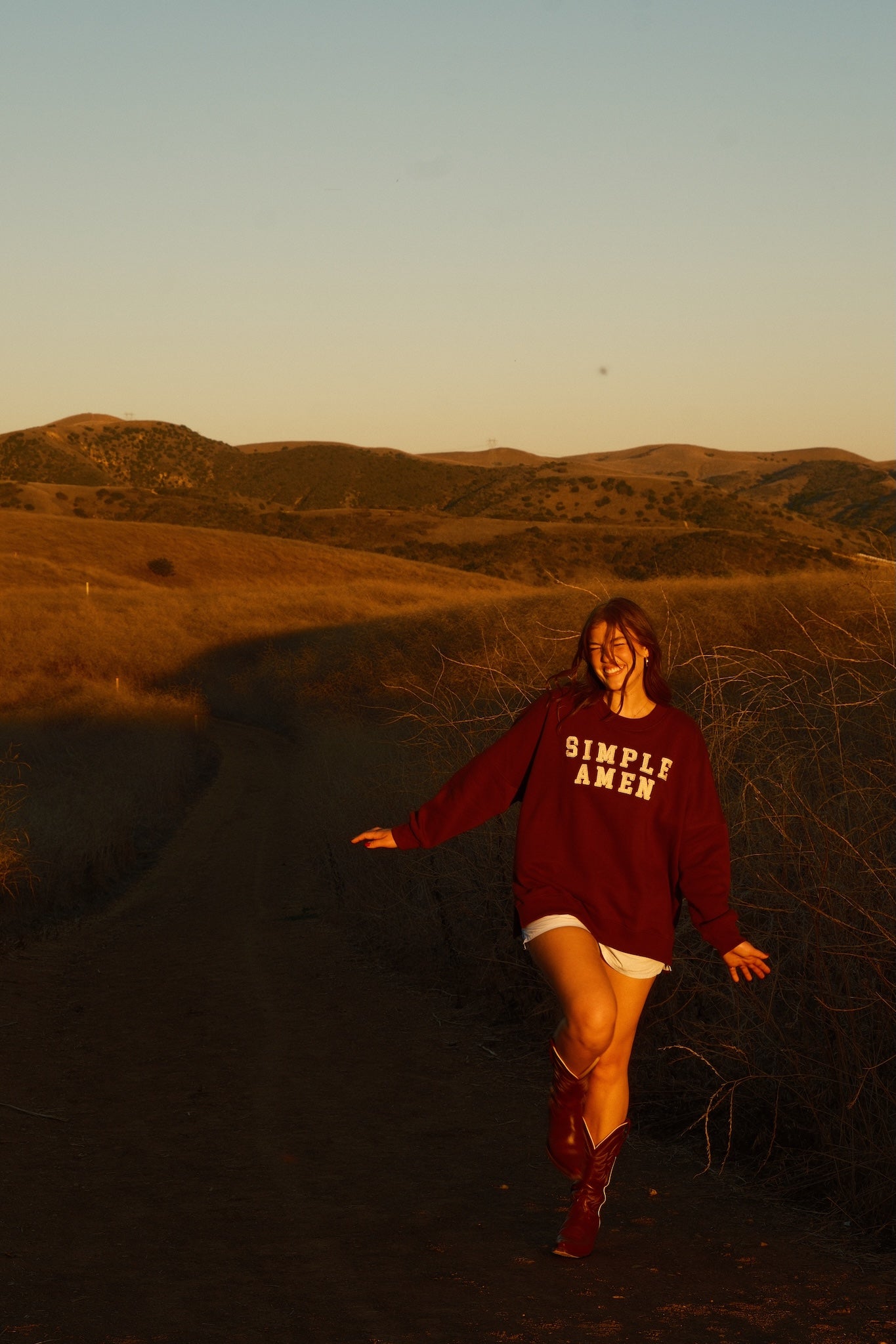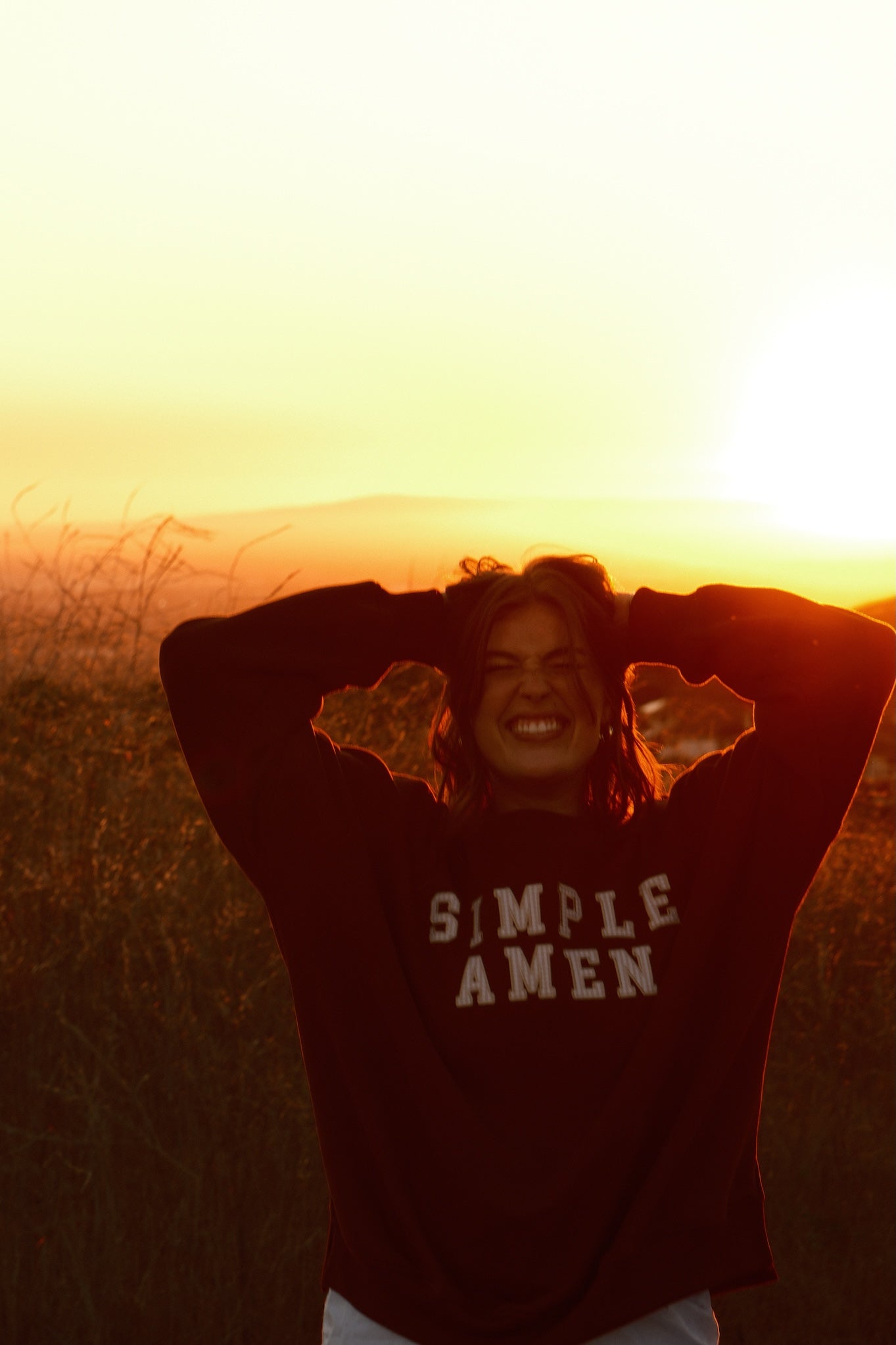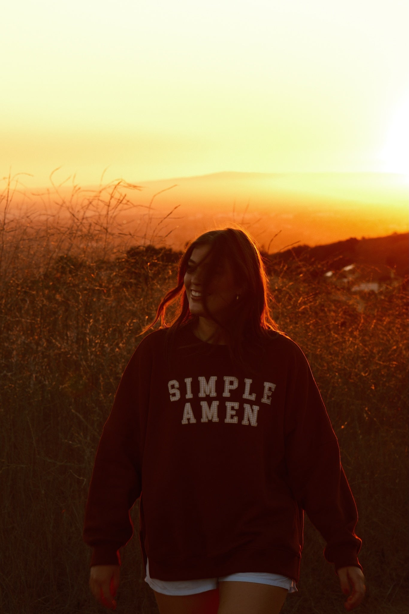 Home, in crewneck form. This intentionally very oversized crewneck wraps you in soft, brushed-fleece comfort with a drapey, slouchy silhouette. Across the front of this brown crewneck, tan gingham “Simple Amen” letters are machine-stitched for a secure, durable finish. Cozy without being heavy, it’s the layer you’ll reach for on slow mornings, late-night drives, and everything in between. One of a kind.